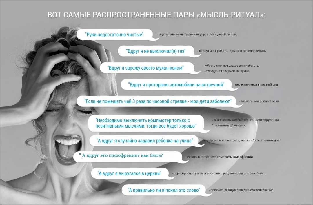 Для каждого человека характерны свои страхи. Чаще всего встречаются мысли о неизлечимых болезнях, боязнь сделать что-то неверно и понести за это наказание, непреодолимое желание перепроверять свои действия.