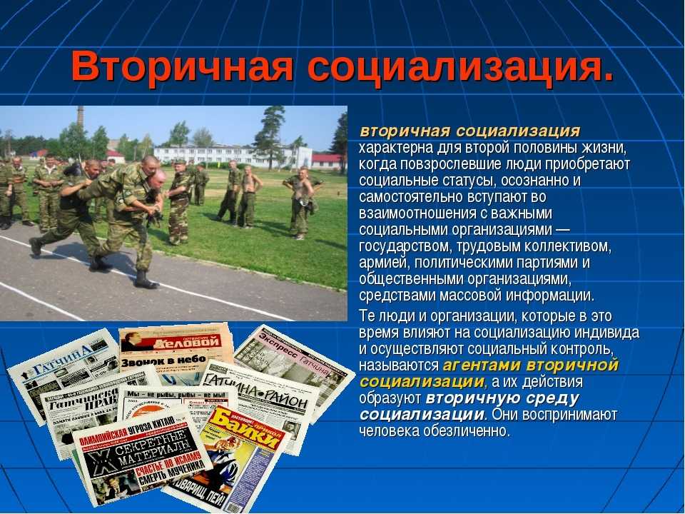 Социализация – процесс освоения индивидом новых социальных ролей, имеет два вида: первичная и вторичная. В каждом из них свой круг агентов и институтов, напрямую влияющих на ход протекания становления личности и её привыкание к жизни в обществе.