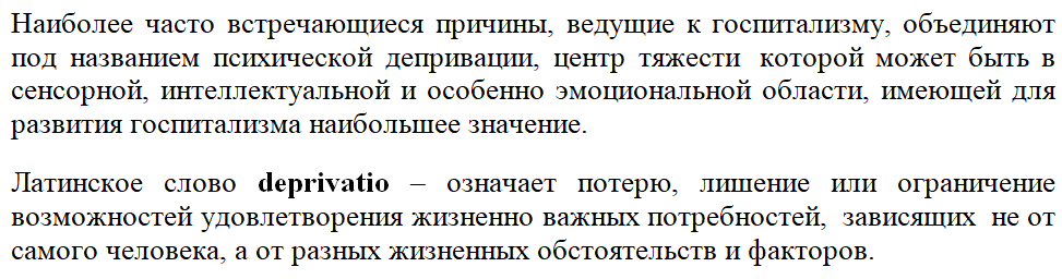 К социальной депривации может привести нахождение в доме ребенка, больнице, закрытых центрах, разного рода интернатах (в том числе, элитных), а также социальное сиротство, безнадзорность и беспризорность…