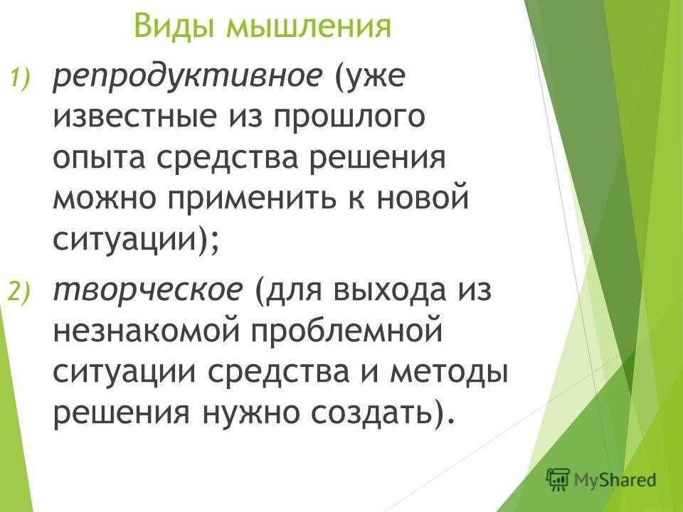 Виды мышления 1) репродуктивное (уже известные из прошлого опыта средства решения можно применить к новой ситуации); 2) творческое (для выхода из незнакомой проблемной ситуации средства и методы решения нужно создать).
