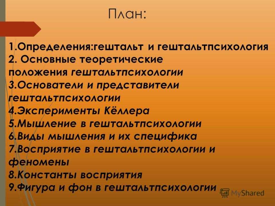 План: 1.Определения:гештальт и гештальтпсихология 2. Основные теоретические положения гештальтпсихологии 3.Основатели и представители гештальтпсихологии 4.Эксперименты Кёллера 5.Мышление в гештальтпсихологии 6.Виды мышления и их специфика 7.Восприятие в гештальтпсихологии и феномены 8.Константы восприятия 9.Фигура и фон в гештальтпсихологии