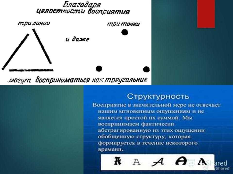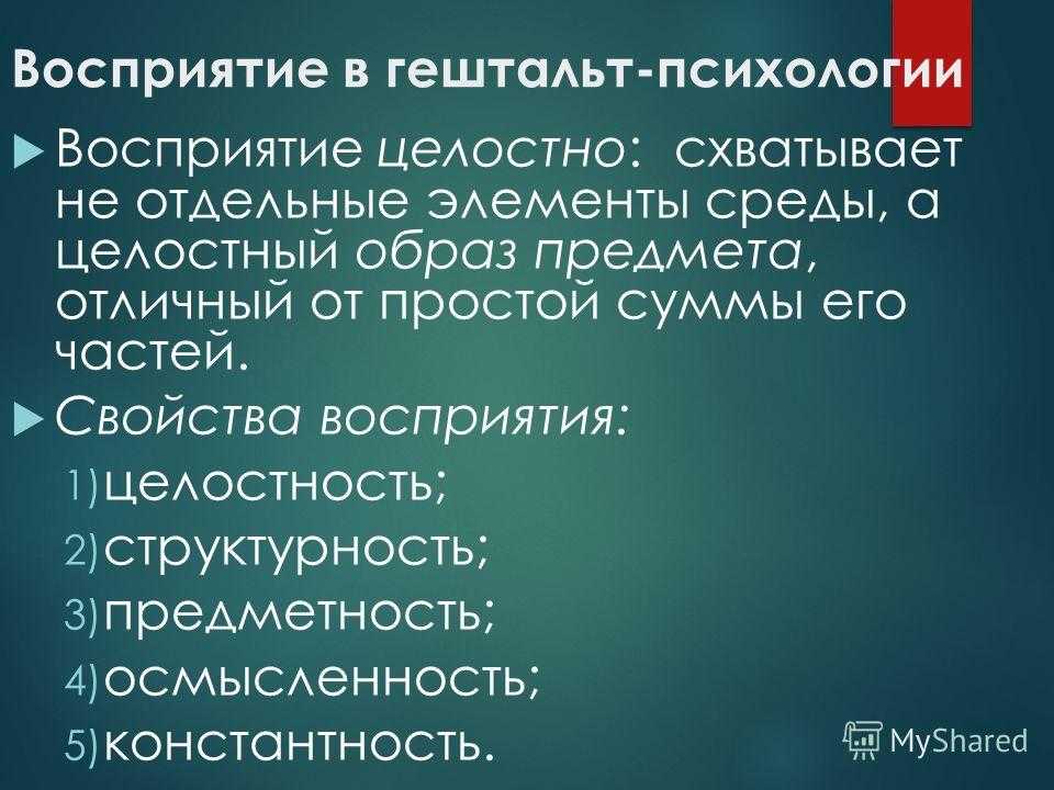 Восприятие в гештальт-психологии Восприятие целостно: схватывает не отдельные элементы среды, а целостный образ предмета, отличный от простой суммы его частей. Свойства восприятия: 1) целостность; 2) структурность; 3) предметность; 4) осмысленность; 5) константность.