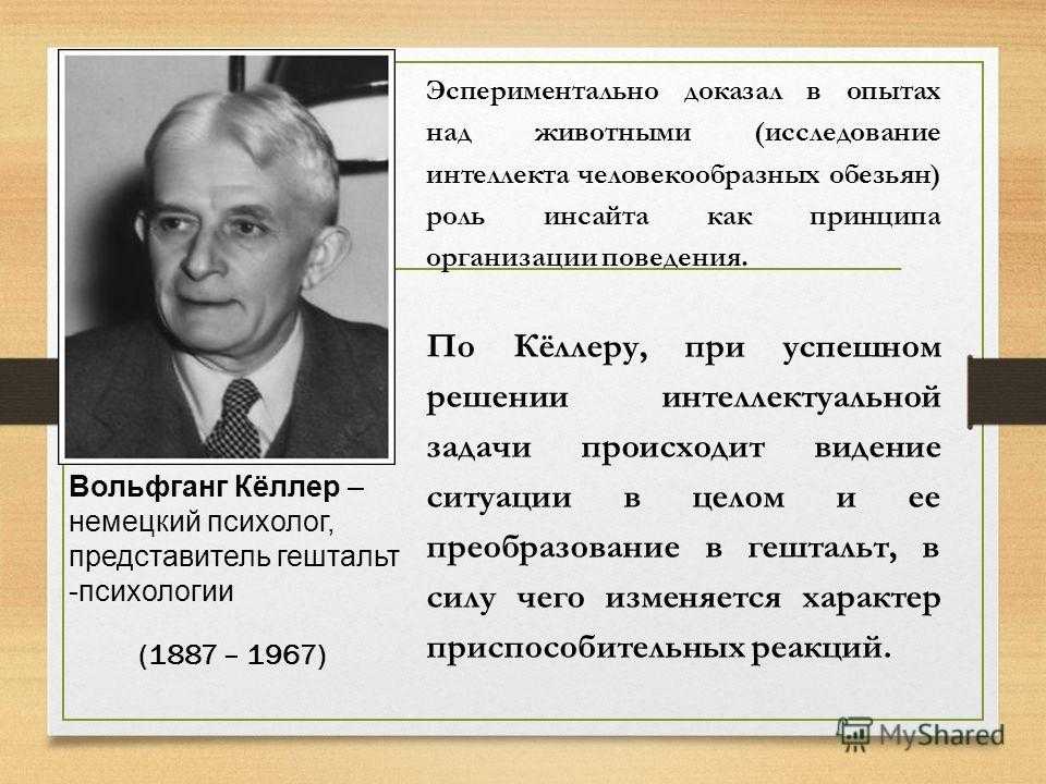 Вольфганг Кёллер (Wolfgang Köhler) В рамках концепции гештальтпсихологии провел революционные исследования разумного поведения животных.