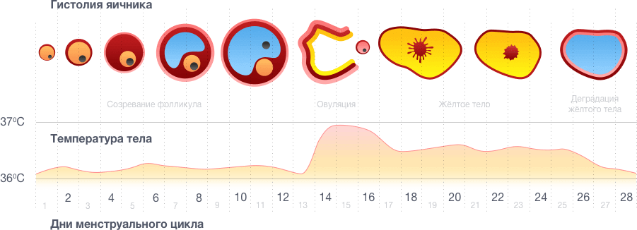 Как видно на этой иллюстрации, созревание фолликула стартует с начала менструации, и в день овуляции яйцеклетка выходит из него. При этом наблюдается повышение температуры тела и рост уровня лютеинизирующего гормона. Эти два признака являются одними из главных симптомов. Расскажем о них подробнее.