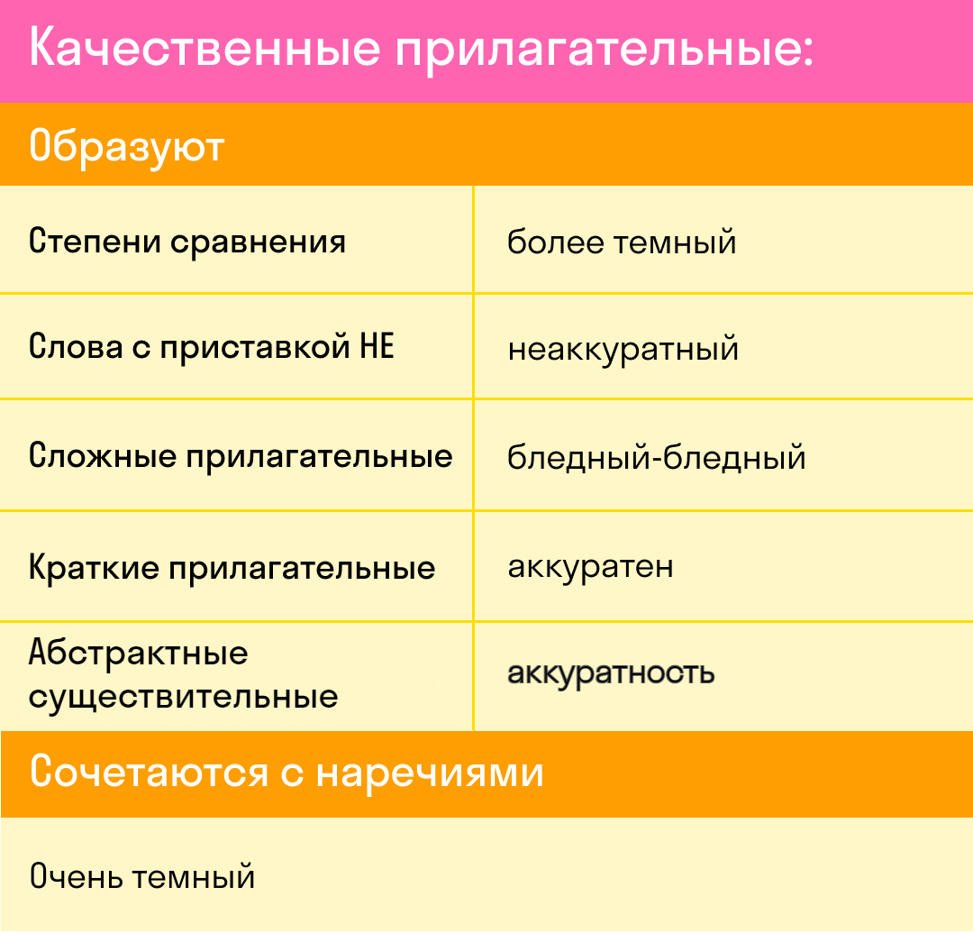 Как мы видим в таблице, каждый разряд прилагательных имеет свои признаки, и в данную группу входят слова, которые описывают качества предмета или явления. Под качествами подразумеваются: