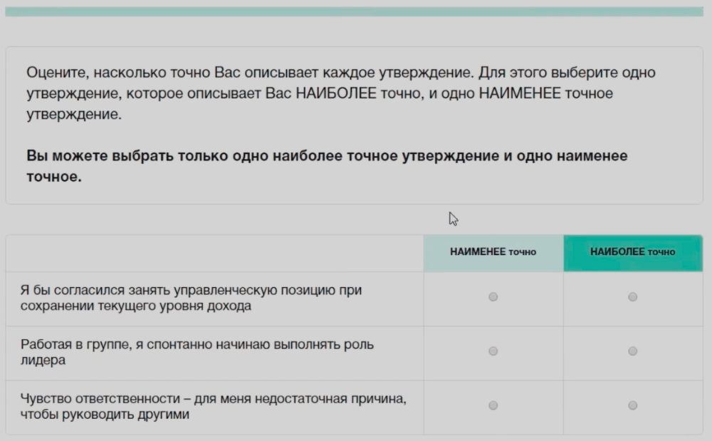 В опросниках нет правильных и неправильных ответов, но, чтобы пройти в полуфинал, нужно соответствовать портрету «идеального лидера», а для этого важно понимать, как человека характеризует то или иное заявление в опроснике