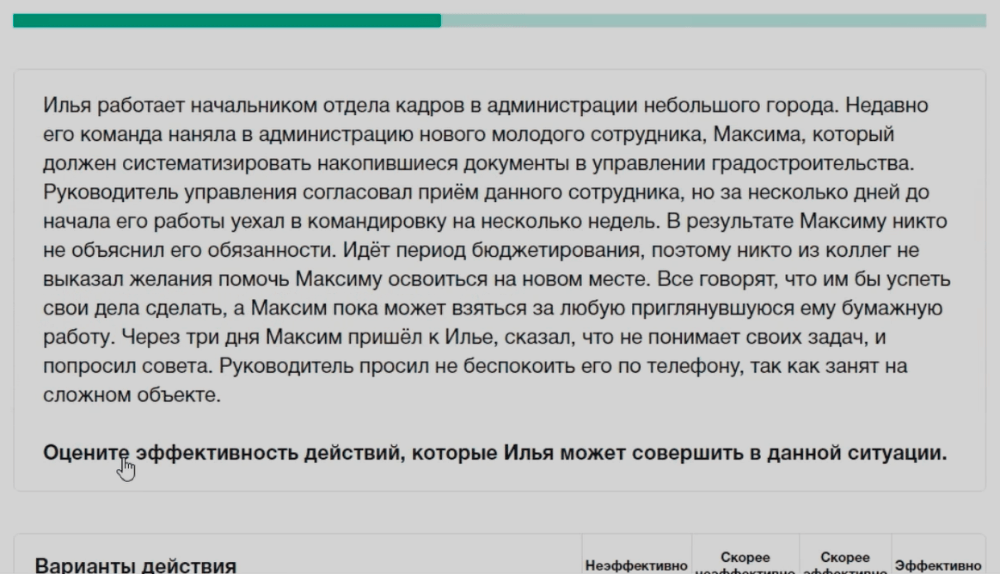 Это первое задание, оценивающее управленческие навыки конкурсанта. По формату оно аналогично предыдущему, различаются лишь сами сценарии.