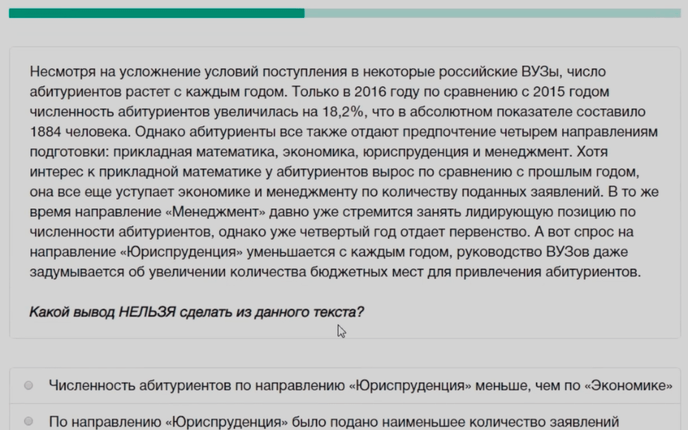 Очередной блок задач по работе с текстом. Участники выбирают из 5 утверждений то, которое соответствует или наоборот, не соответствует главной мысли текста. Время ограничено для всего блока, как в заданиях на пространственный интеллект. Участнику придется самостоятельно контролировать таймер, и планировать свое время.